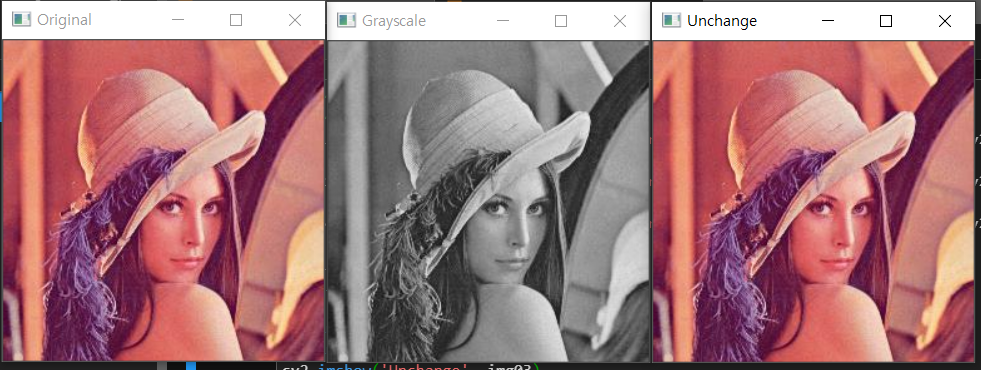 cv2.imshow('Original', img01) cv2.imshow('Grayscale', img02) cv2.imshow('Unchange', img03) cv2.waitKey(0) cv2.destroyAllWindows()cv2.imshow(title, image) 읽어드린 이미지를 원도우창에 보여줍니다.