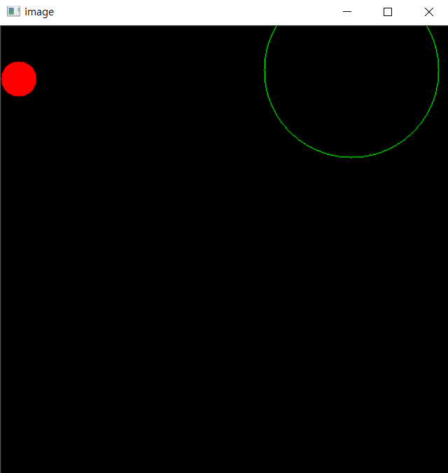 import numpy as np import cv2 #np.zeros로 모두 0 (검정색)으로 되있는 창을 하나 만듭니다. img = np.zeros((512, 512, 3), np.uint8) # 적용할이미지 원의중심좌표(x,y) 반지름 B G R 선의 두께 img = cv2.circle( img, (20,60), 20, (0, 0, 255), -1) img2 = cv2.circle( img, (400,50), 100, (0, 255, 0), 1) cv2.imshow('image',img) cv2.imshow('image',img2) cv2.waitKey(0) cv2.destroyAllWindows()