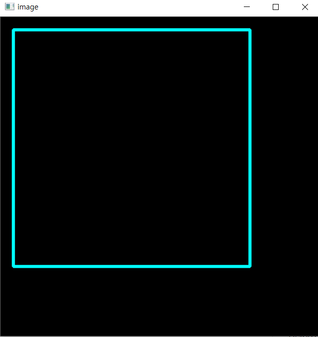 import numpy as np import cv2 #np.zeros로 모두 0 (검정색)으로 되있는 창을 하나 만듭니다. img = np.zeros((512, 512, 3), np.uint8) # 적용할이미지 시작좌표 종료 좌표 B G R 선의 두께 img = cv2.rectangle(img, (20, 20), (400, 400), (255, 255, 0), 3) cv2.imshow('image',img) cv2.waitKey(0) cv2.destroyAllWindows()