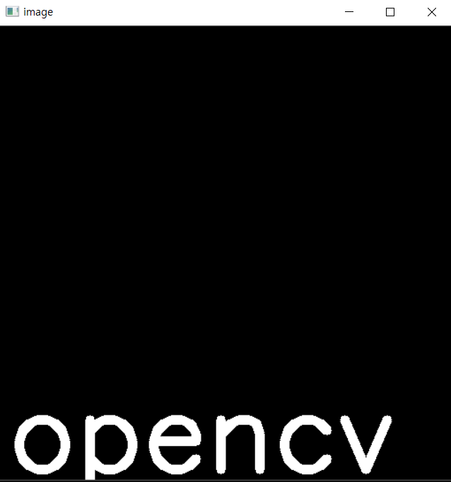 import numpy as np import cv2 #np.zeros로 모두 0 (검정색)으로 되있는 창을 하나 만듭니다. img = np.zeros((512, 512, 3), np.uint8) # 적용할이미지 표시할문자열 문자열의 좌표값 폰트 글자크기 B G R 선의 두께 cv2.putText(img, 'opencv', (10,500), cv2.FONT_HERSHEY_SIMPLEX, 4, (255,255,255), 10) cv2.imshow('image',img) cv2.waitKey(0) cv2.destroyAllWindows()