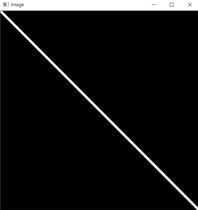 import numpy as np import cv2 #np.zeros로 모두 0 (검정색)으로 되있는 창을 하나 만듭니다. img = np.zeros((512, 512, 3), np.uint8) #라인 그리기 적용할이미지 시작좌표 종료 좌표 B G R 선의 두께 img = cv2.line( img, (0, 0), (511, 511), (255, 255, 255), 5) cv2.imshow('image',img) cv2.waitKey(0) cv2.destroyAllWindows()