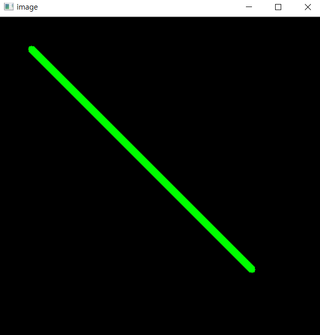 B G R을 값을 최대의 값을 주었을때 흰색으로 선이 생깁니다. import numpy as np import cv2 #np.zeros로 모두 0 (검정색)으로 되있는 창을 하나 만듭니다. img = np.zeros((512, 512, 3), np.uint8) #라인 그리기 적용할이미지 시작좌표 종료 좌표 B G R 선의 두께 img = cv2.line( img, (50, 50), (400, 400), (0, 255, 0), 10) cv2.imshow('image',img) cv2.waitKey(0) cv2.destroyAllWindows()