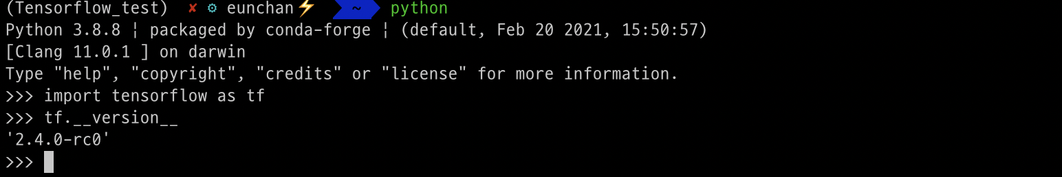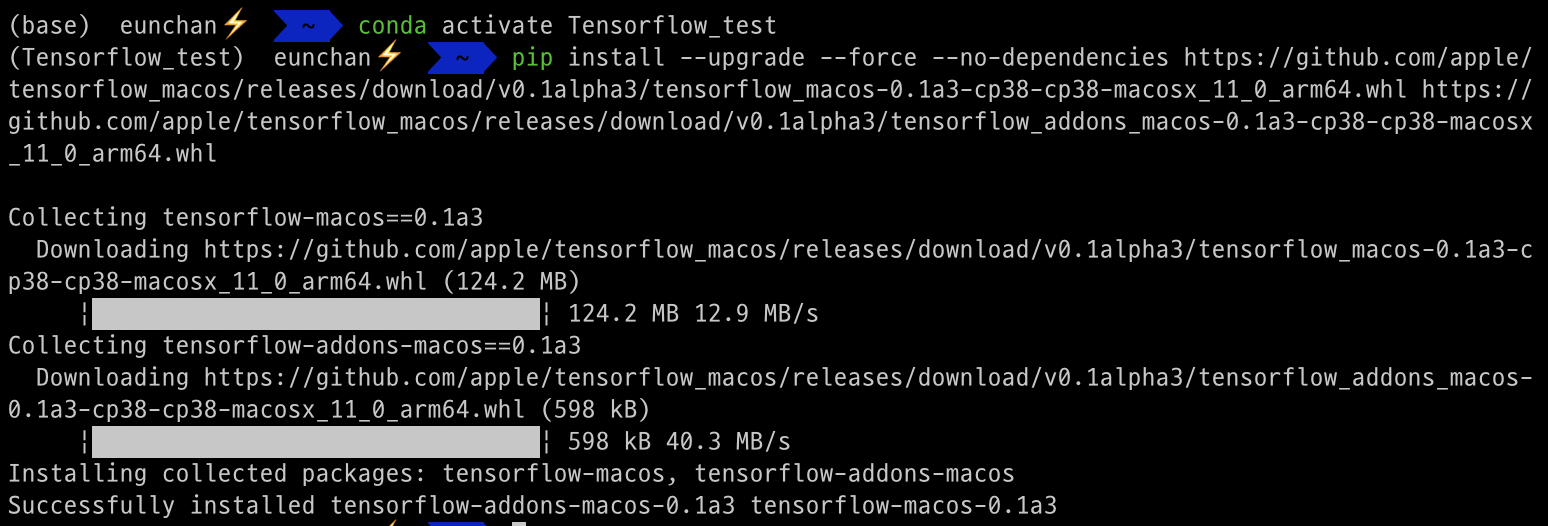 conda activate 가상환경이름 #가상환경 접속후 입력 pip install --upgrade --force --no-dependencies https://github.com/apple/tensorflow_macos/releases/download/v0.1alpha3/tensorflow_macos-0.1a3-cp38-cp38-macosx_11_0_arm64.whl https://github.com/apple/tensorflow_macos/releases/download/v0.1alpha3/tensorflow_addons_macos-0.1a3-cp38-cp38-macosx_11_0_arm64.whl