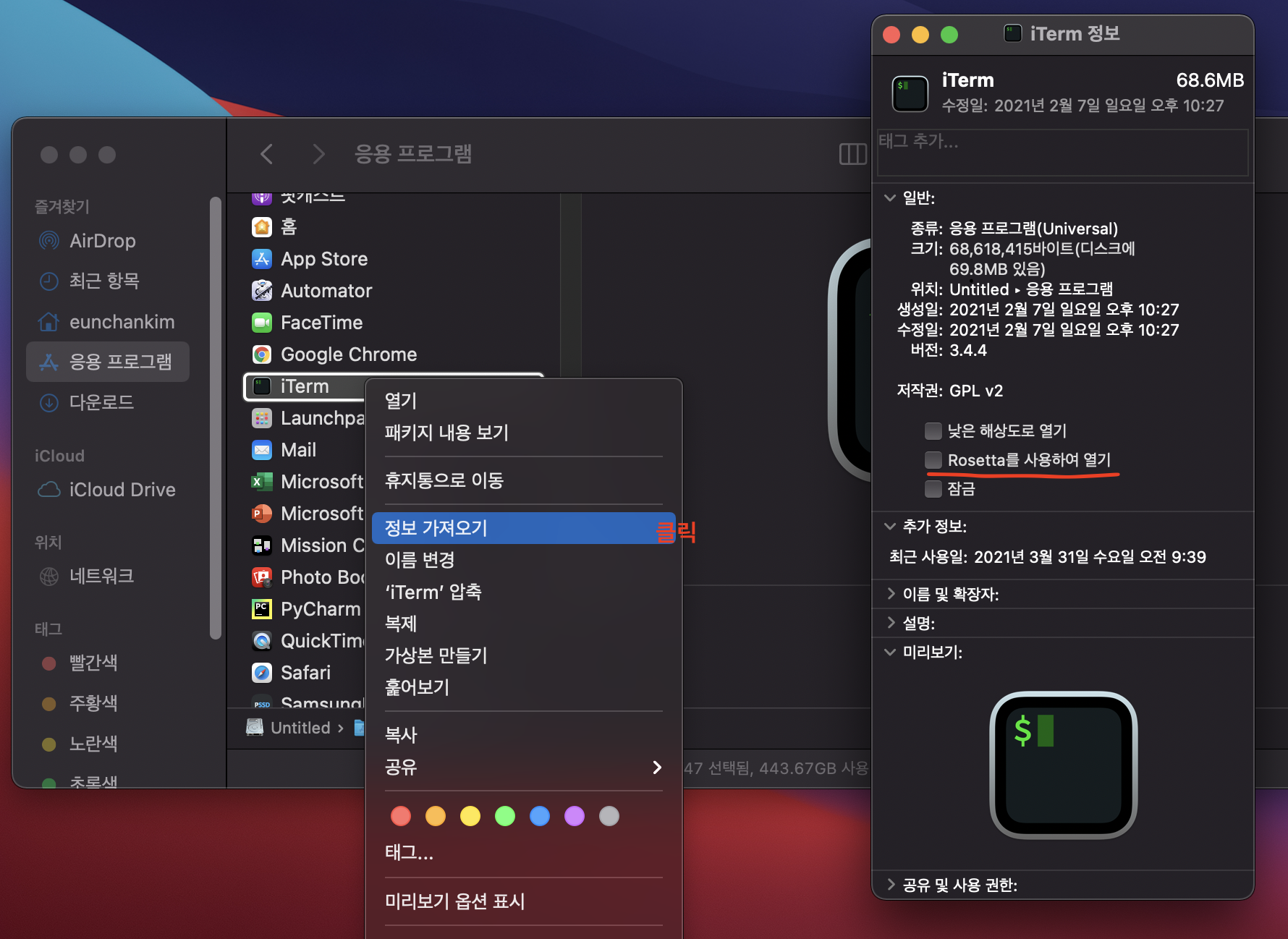 그렇기 때문에 Rosetta가 켜져있는지 먼저 확인을 하고 터미널을 실행시킨다.