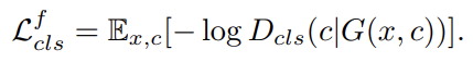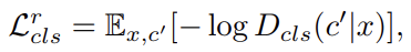 - Dcls(c'|x)는 real image x가 주어졌을 때 D 가 계산해낸 domain label c'일 확률분포입니다