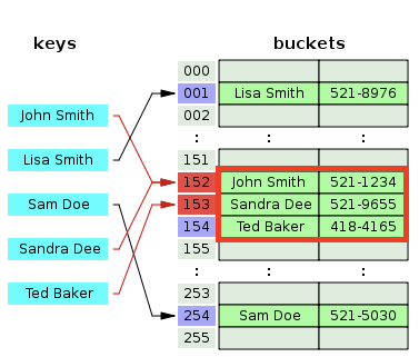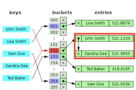 위 그림을 보면 John Smith 와 Sandra Dee 의 인덱스가 152 로 충돌이 일어났을때 Sandra Dee 를 John Smith 뒤에 연결함으로써 충돌을 처리하는 것을 말합니다.