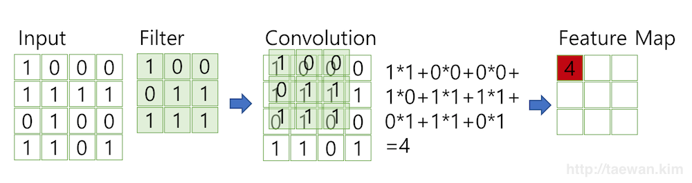 stride가 1로 설정되었기 때문에 필터가 1칸씩 이동하면서 합성곱을 계산합니다.
