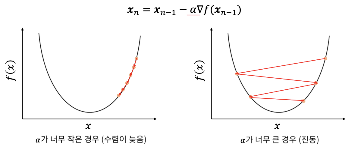 학습률(Learning rate)이 큰 경우 한 번 이동하는 거리가 커지므로 빠르게 수렴할 수 있다는 장점이 있습니다. 하지만, 학습률(Learning rate)을 너무 크게 설정해버리면 최솟값을 계산하도록 수렴하지 못하고 함숫값이 계속 커지는 방향으로 최적화가 진행될 수도 있습니다.