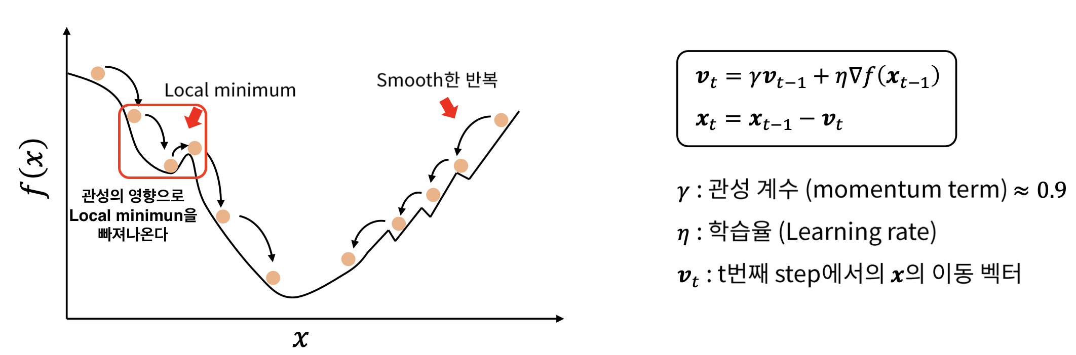 - 관성을 이용하면 Local Minimum에 대처할 수 있습니다