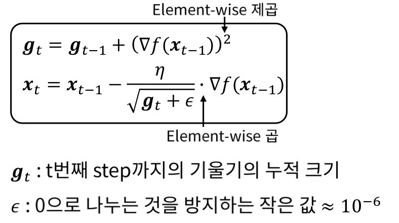 - Element-wise 제곱으로 gt가 커져서 학습이 많이 된 변수는 학습률을 감소시키고, 그렇지 못한 변수들이 학습될 수 있도록 합니다.