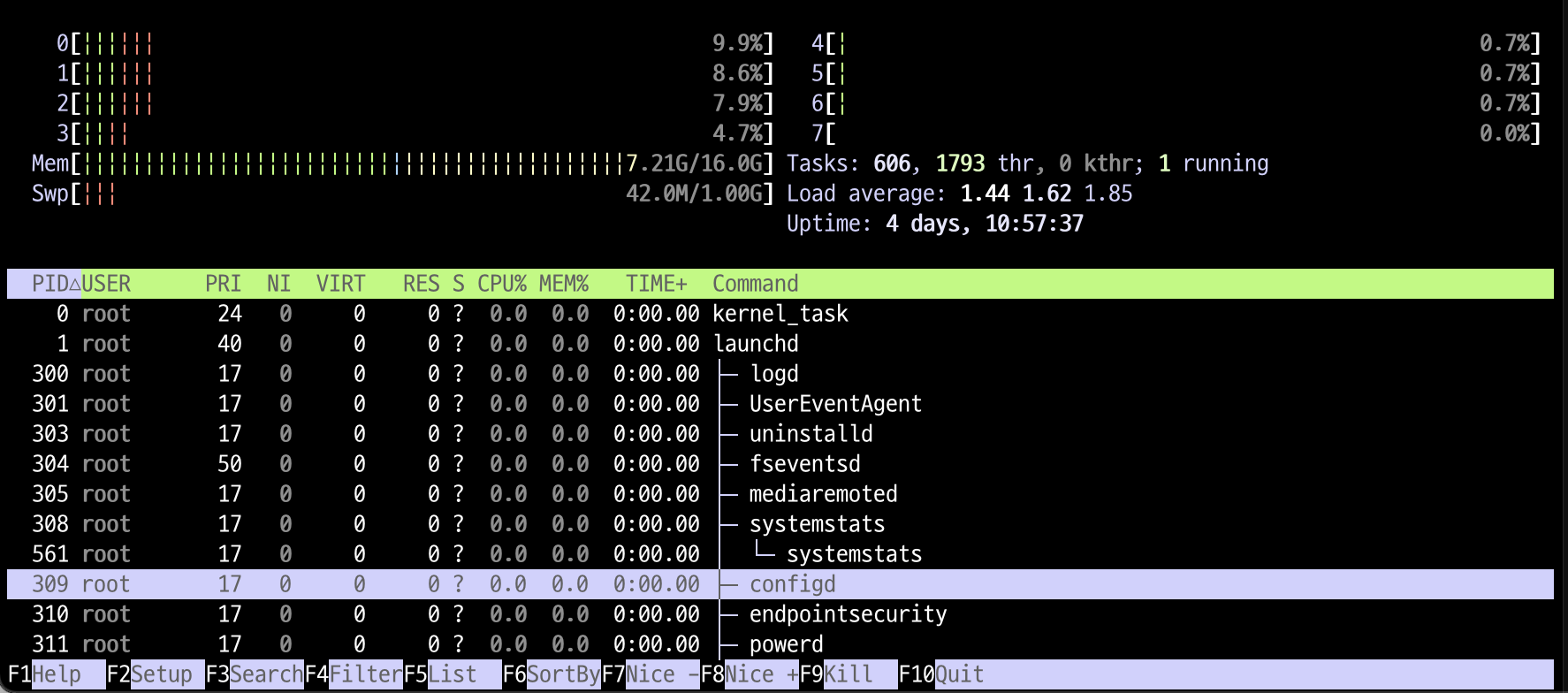 - F1 : htop의 도움말을 볼 수 있으며, 단축키의 기능을 알 수 있습니다.