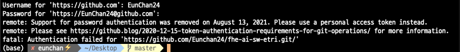 에러를 보니까 이제 비밀번호 로그인 방식은 2021년 8월 13일 이후로 지원을 안 하고 토큰이 필요하다고 하네요