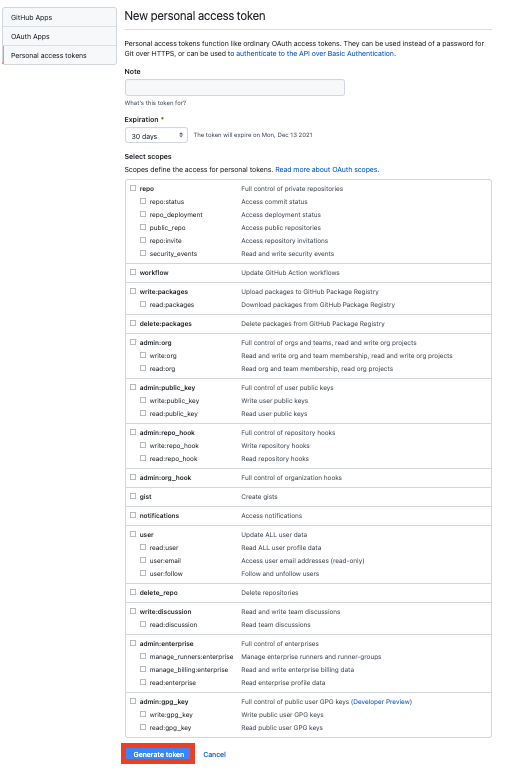 위의 사진처럼 여러 가지 옵션이 나오는데 여기서 각자 옵션에 맞게 선택하고 generate token 버튼을 클릭해서 토큰 발급을 진행하면 됩니다! 다 진행하고 나면 token 코드가 나오는데 복사해서 안전한 곳에 보관해둡니다.!