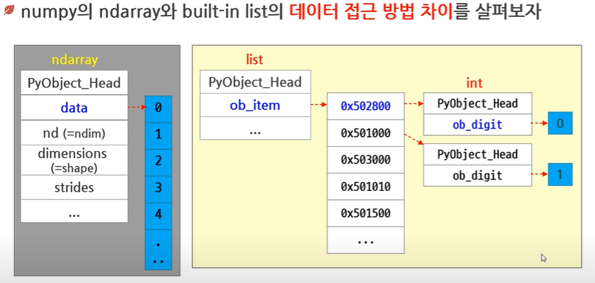 - ndarray는 int type의 data를 저장할 때 element들이 메모리에 연속적으로 저장되어 있지만 list의 경우 int type data의 값들이 메모리에 연속적으로 저장돼있지 않고 element의 주소를 가지고 있습니다. 주소를 타고 가더러도 객체 자체가 있고, 객체 내에서 ob_digit으로 간 다음 element에 접근해야 합니다. ndarray에 비해 list가 접근 단계가 많습니다.