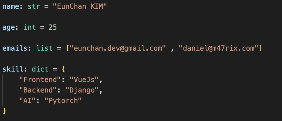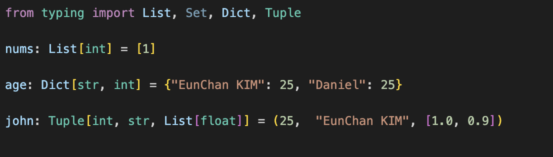 먼저 매우 간단한 변수에 타입 힌트를 추가하는 방법에 대해서 알아보겠습니다. 변수 이름 뒤에 콜론(:)을 붙이고 타입을 명시해주면 됩니다.