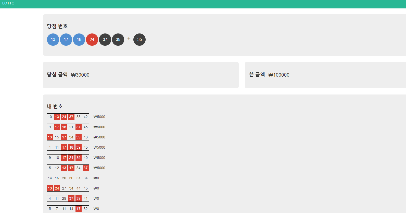 from random import randint def generate_numbers(n): numbers = [] while len(numbers) < n: new_number = randint(1, 45) if new_number not in numbers: numbers.append(new_number) return numbers def draw_winning_numbers(): winning_numbers = generate_numbers(7) return sorted(winning_numbers[:6]) + winning_numbers[6:] def count_matching_numbers(numbers, winning_numbers): count = 0 for num in numbers: if num in winning_numbers: count = count + 1 return count def check(numbers, winning_numbers): count = count_matching_numbers(numbers, winning_numbers[:6]) bonus_count = count_matching_numbers(numbers, winning_numbers[6:]) if count == 6: return 1000000000 elif count == 5 and bonus_count == 1: return 50000000 elif count == 5: return 1000000 elif count == 4: return 50000 elif count == 3: return 5000 else: return 0 # 테스트 print(check([2, 4, 11, 14, 25, 40], [4, 12, 14, 28, 40, 41, 6])) print(check([2, 4, 11, 14, 25, 40], [2, 4, 10, 11, 14, 40, 25]))테스트해보니까 잘된다.. 엄청 오래 걸렸다.